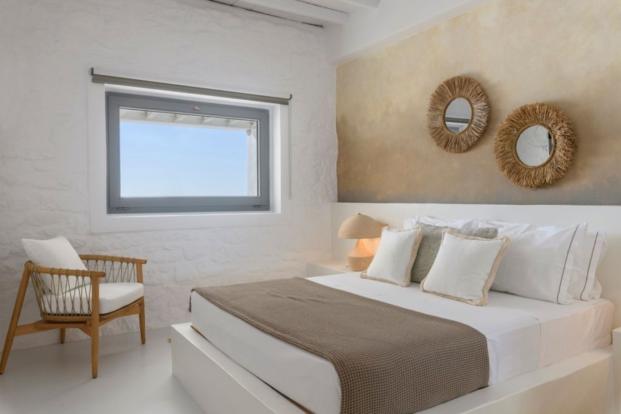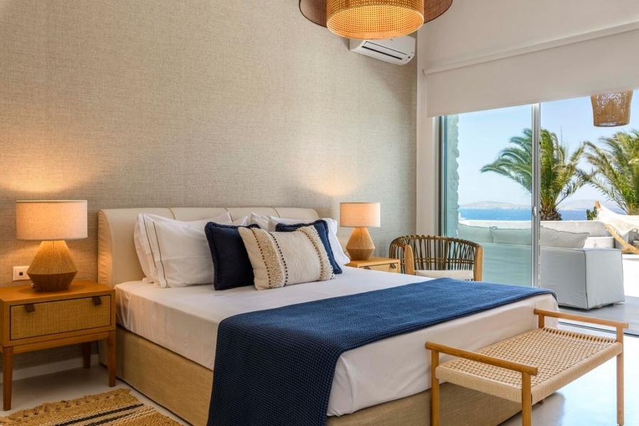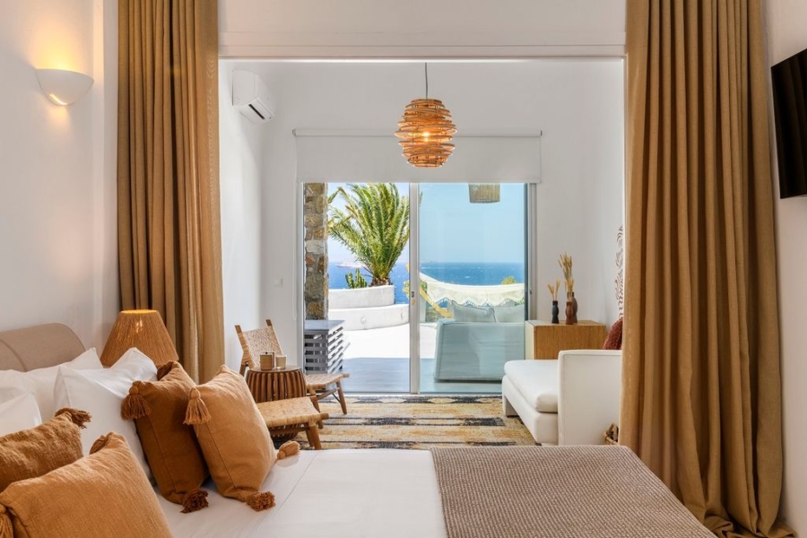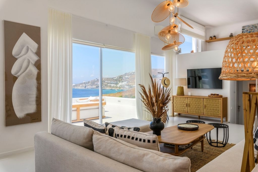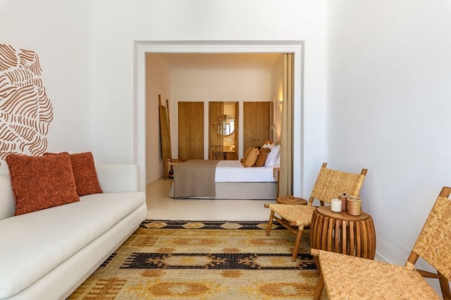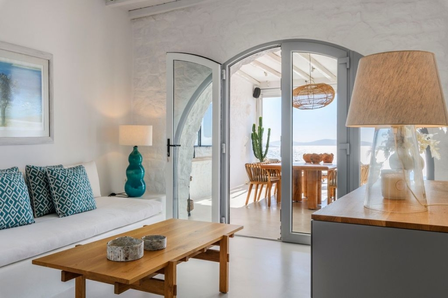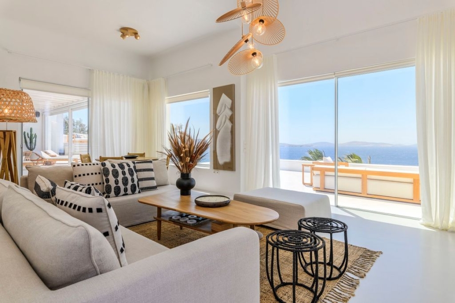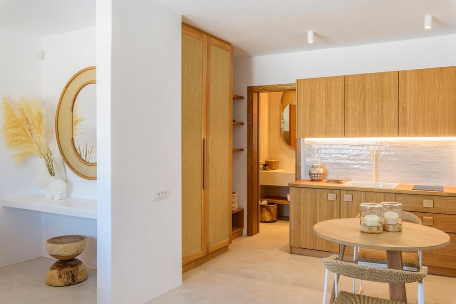At the main building the indoor area is covered from a living room with access to a private terrace , access to the pool area, a dining area, a fully equipped open plan kitchen, a single bedroom with wide window / terrace – sea view.