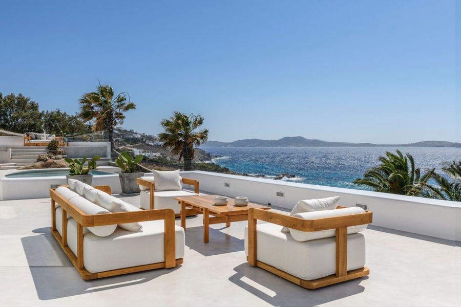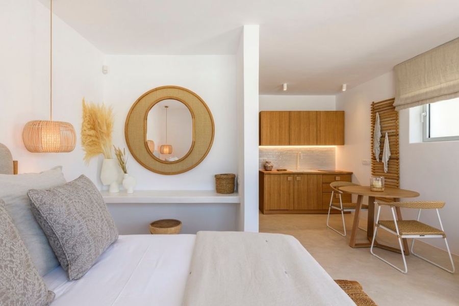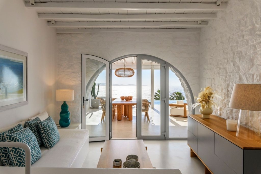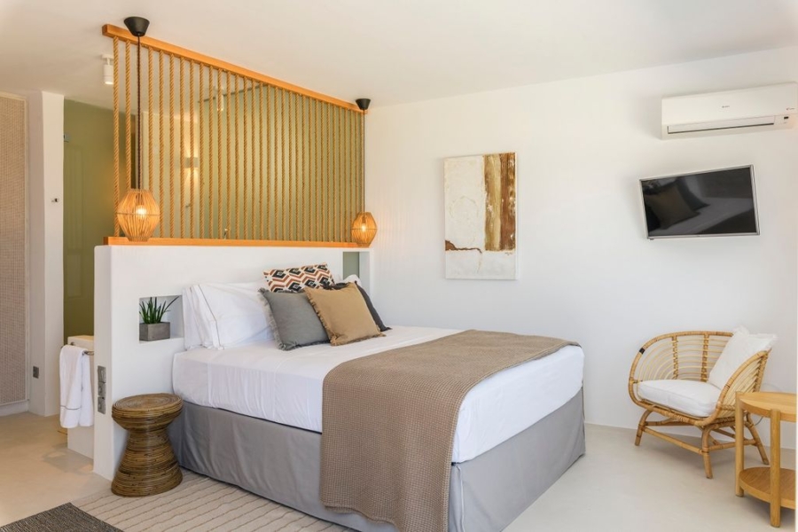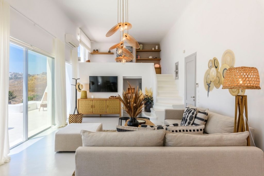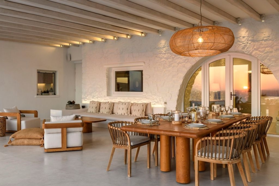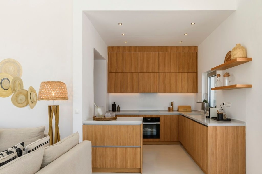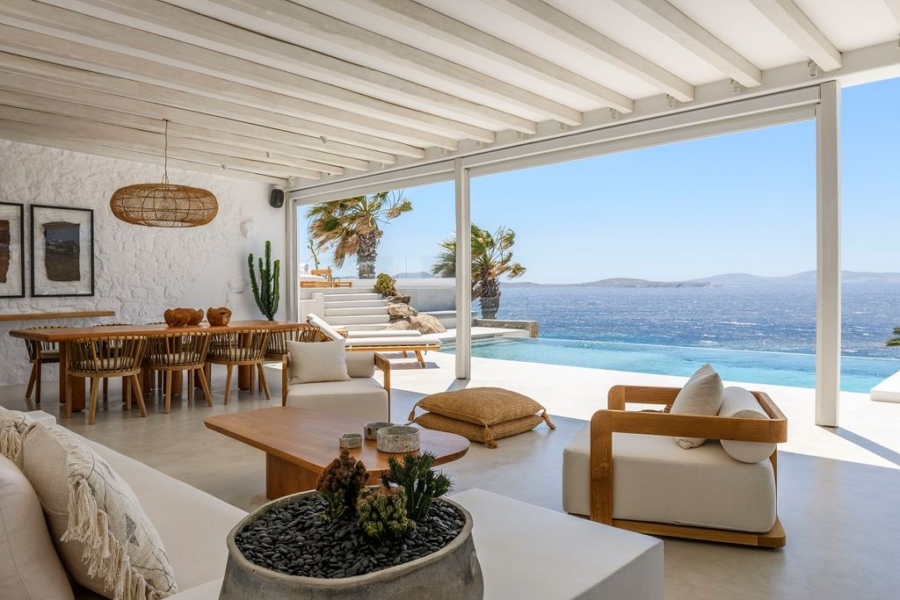 At the main building the indoor area is covered from a living room with access to a private terrace , access to the pool area, a dining area, a fully equipped open plan kitchen, a single bedroom with wide window / terrace – sea view.