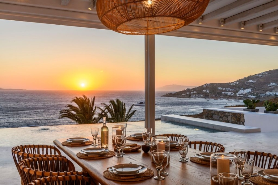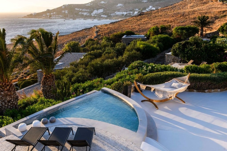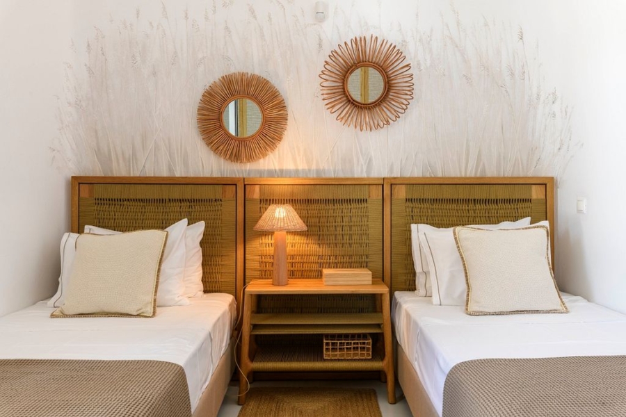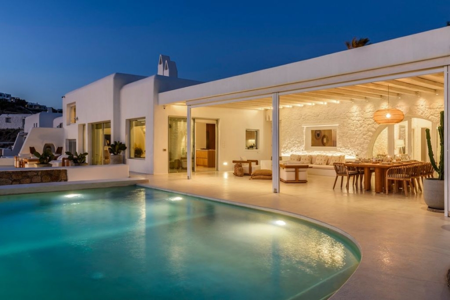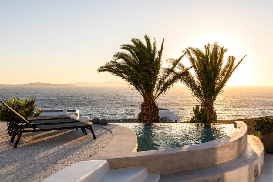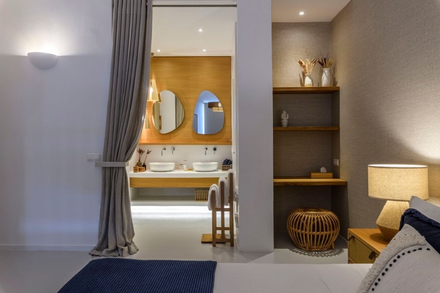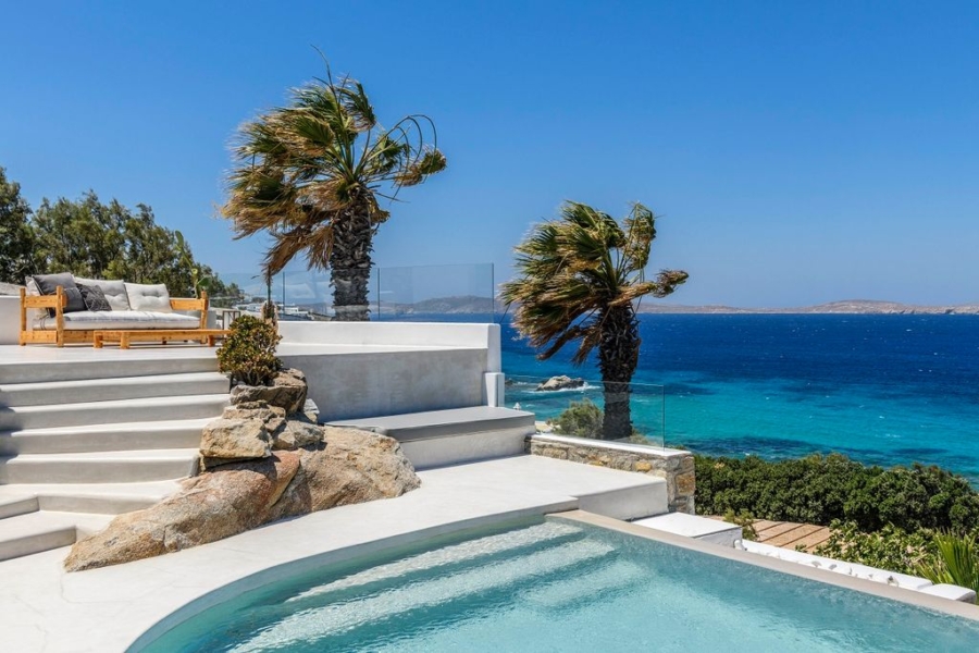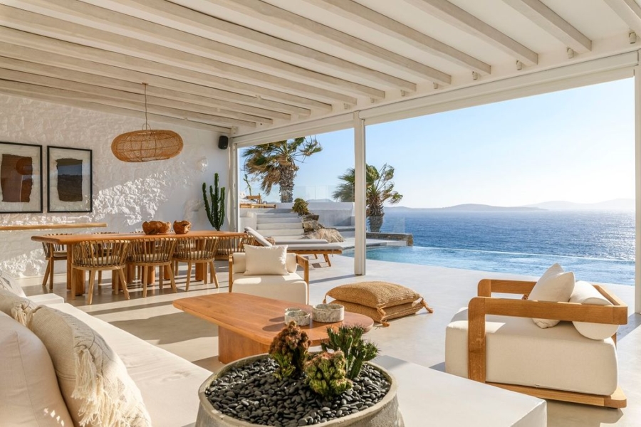 At the main building the indoor area is covered from a living room with access to a private terrace , access to the pool area, a dining area, a fully equipped open plan kitchen, a single bedroom with wide window / terrace – sea view.